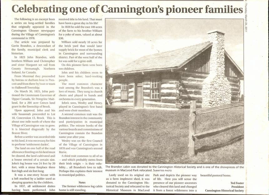 Brandon was one of four siblings who had emigrated from county Fermanagh in Northern Ireland bound for Canada. John was approved for a 200-acre parcel on lot 18 of Concession 13 in Brock Township on March 30, 1825 – about a mile north and east of the village of Cannington. Their property was bisected by the Beaver River, and underlain by a rich clay soil.