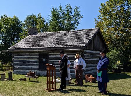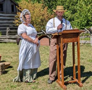 Maureen Collins playing Susanna Brandon and Brandon Collins playing John Brandon at an event recognizing 200 years of European settlement in Brock. Maureen and Brandon are direct descendants of the original Brandon family.